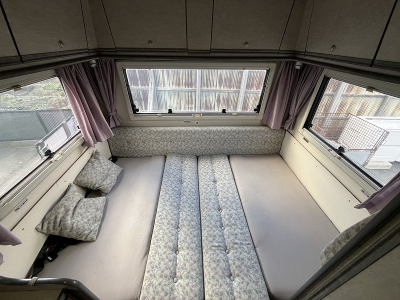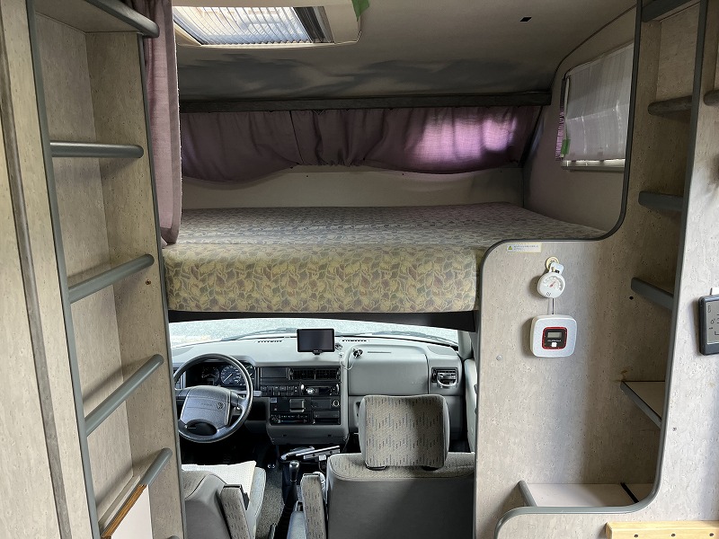 架装の形は運転席上部がバンクベッドになっており、居住部へのエントランスは右側となっております。